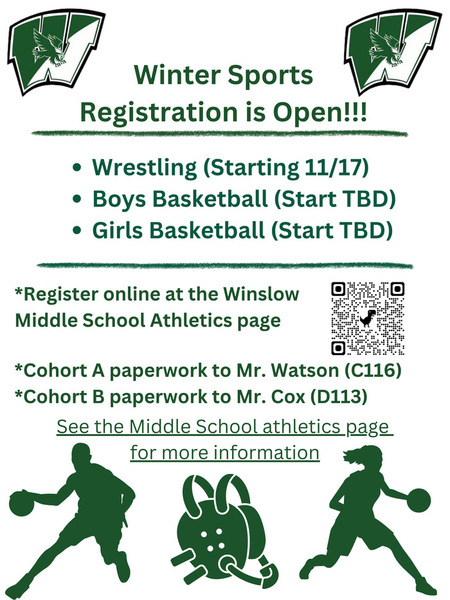 Register now online for wrestling (practice starting 11/17) and boys/girls basketball (start date TBD) using the link below. Physical packets are available online or with Mr. Watson in C116 (Cohort A) or Mr. Cox in D113 (Cohort B).